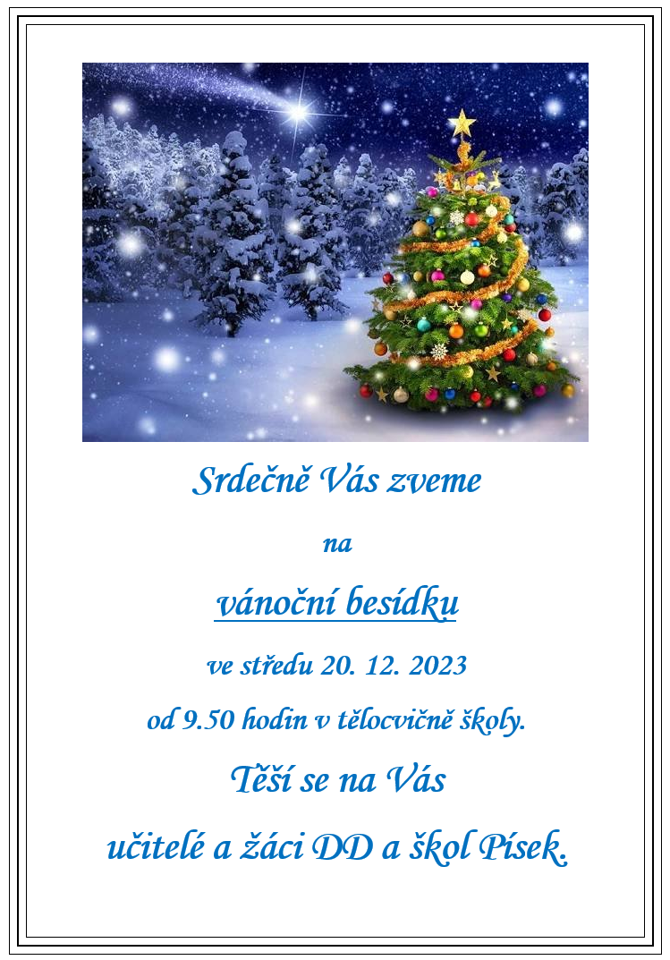 Srdečně Vás zveme na vánoční besídku ve středu 20. 12. 2023 od 9.50 hodin v tělocvičně školy.