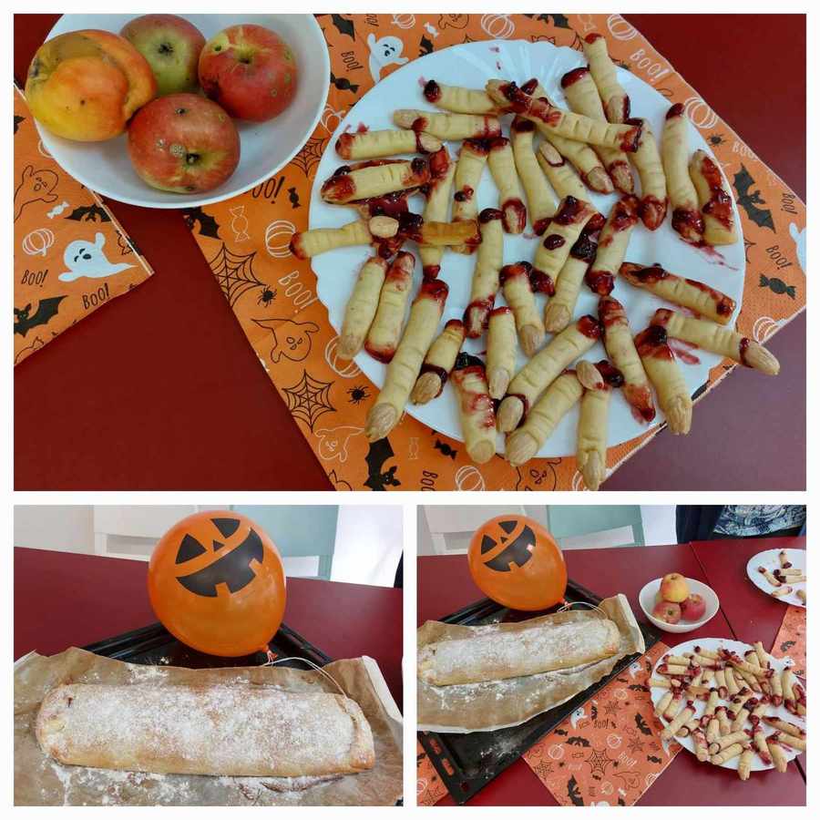Na 31.říjen jsme si naplánovali Halloweenské vaření. Vždyť i strašidelné pokrmy patří společně s maskami, svíčkami a vyřezávanými dýněmi k symbolům tohoto původně keltského svátku. Přípravu halloweenských pochoutek i následnou hostinu, kterou jsme doladili dekoracemi s tématikou svátku, jsme si všichni moc užili.